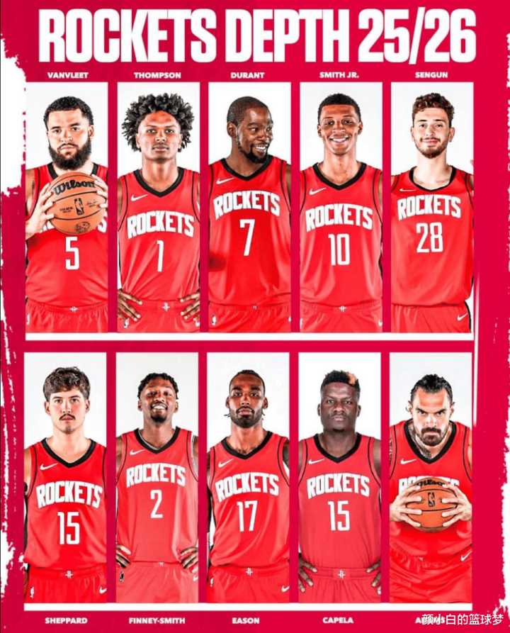 2025-26休赛期拉斐尔-斯通敲定了历史级球星凯文-杜兰特的交易,36岁的杜兰特加盟这支年轻的团队,杜兰特为球队注入了总冠军基因。火箭队换杜兰特的代价也非常小,年轻核心只牺牲了杰伦-格林一人,轮换也就出了狄龙,10号签(马鲁阿奇)、5个次轮签,这完全没有动摇火箭的核心班底。