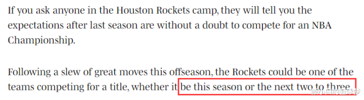 文中第一段就写道:上赛季的火箭队目标已经从重建改为了竞争总冠军,经过今夏拉斐尔-斯通的一系列运作,火箭队不管是下赛季还是未来2-3年里都会是总冠军的有力竞争者。